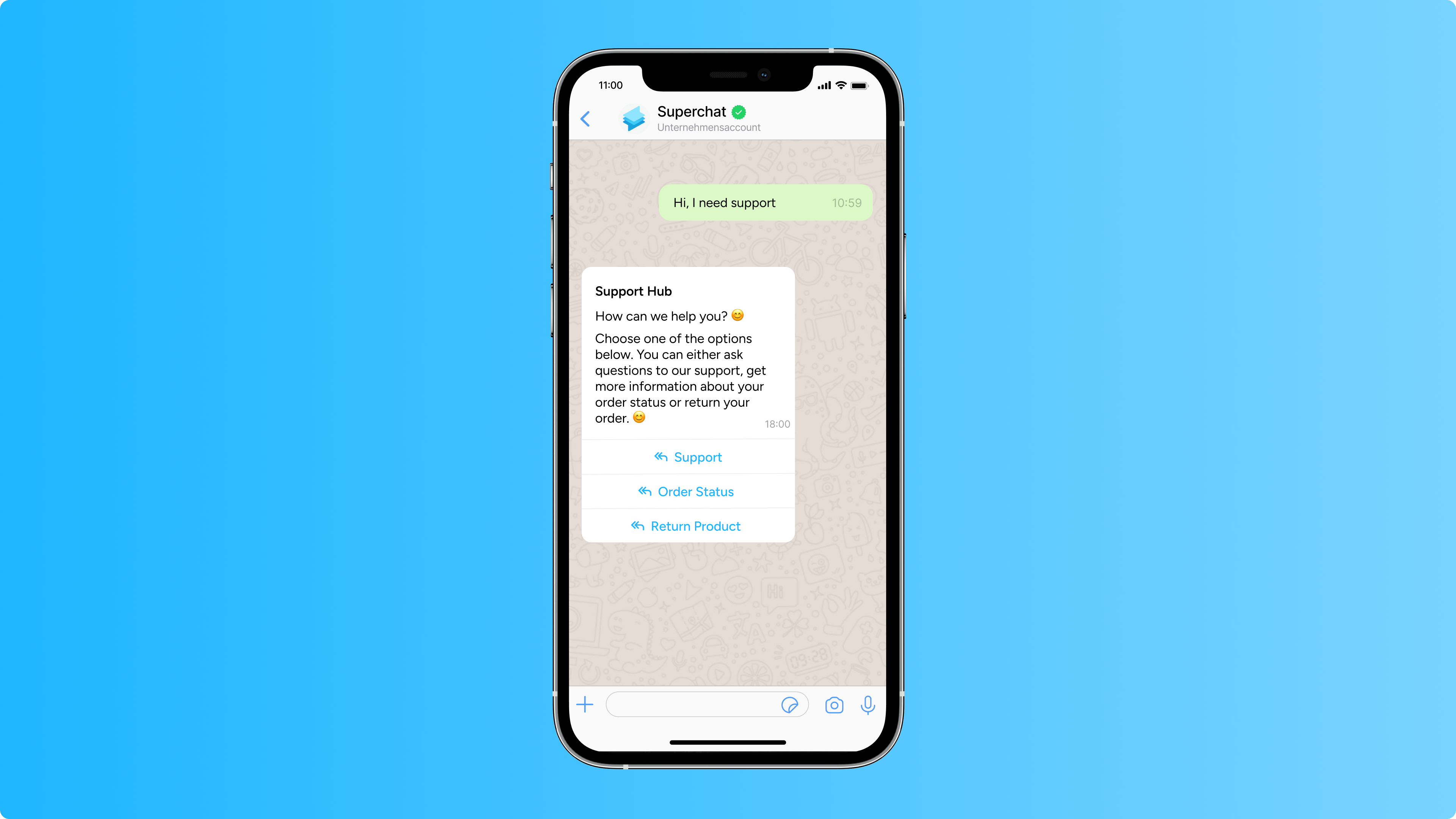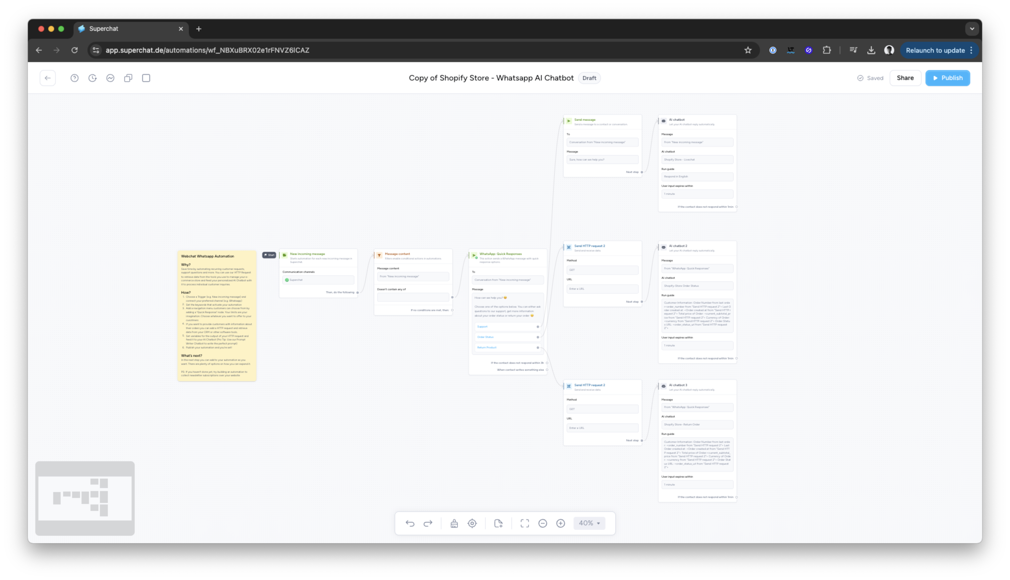 Diese Automation ermöglicht es dir, Kunden spezifische Informationen zu ihrem Lieferstatus oder zu Rückgabeoptionen sowie Supportdienste anzubieten. Alle Interaktionen werden mithilfe von KI-Chatbots automatisiert. Deine Kunden können auf diese Automation zugreifen, indem sie den QR-Code auf deinem Webchat-Widget scannen oder auf den Link „WhatsApp Me“ klicken.