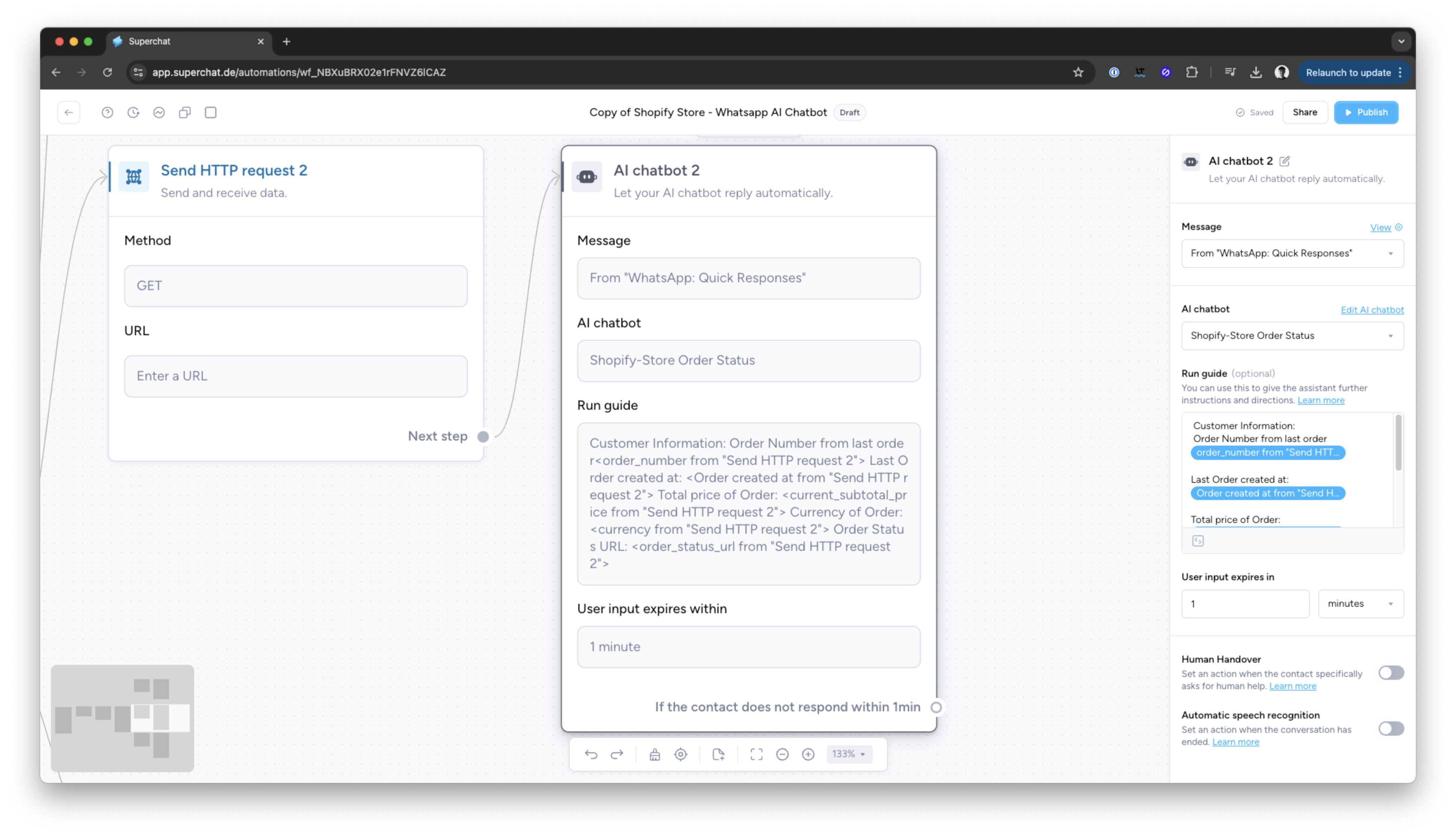 Lege eine Variable für den gewünschten Inhalte im „Response“ Ihrer HTTP-Anfrage fest (z. B. Bestellstatus, Erstellungsdatum der Bestellung, Bestellnummer usw.). → Dies hängt von den Informationen ab, die du aus deinem E-Commerce-Shop/Tool abrufen und mit deinen Kunden teilen möchten.