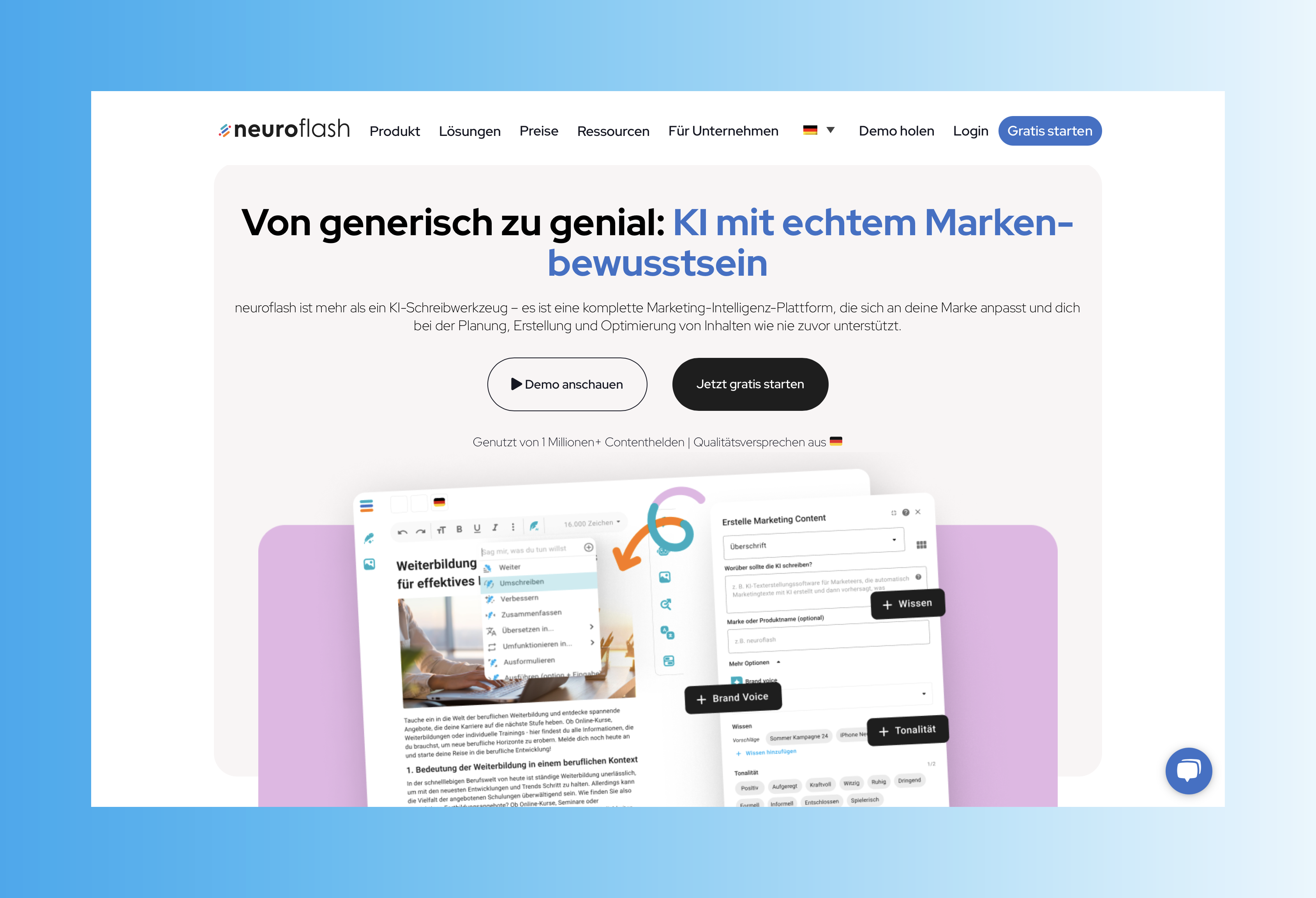 neuroflash ist eine deutsche KI-Plattform für Texterstellung, die sich besonders für Marketing, Content Creation und SEO eignet.