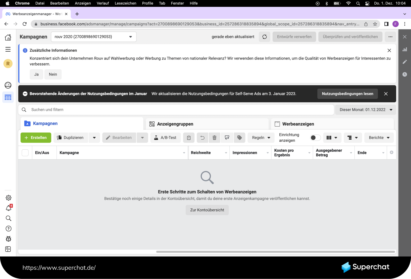 Voraussetzung für das Schalten von Werbung ist, neben der genannten Facebook Unternehmensseite, ein ebenfalls vollständig eingerichteter Facebook Business Manager.
