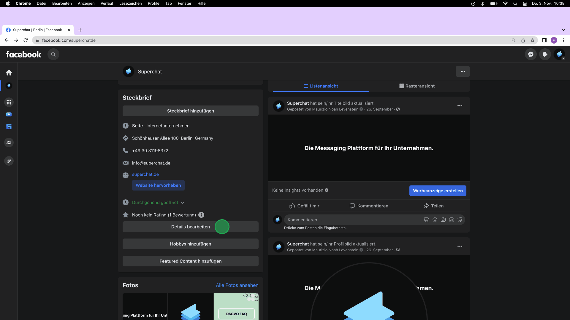 Zudem sollten Sie Ihren Steckbrief vollständig ausfüllen. Hier finden Besucher u.a. die Adresse Ihres Unternehmens oder Kontaktmöglichkeiten via Mobilnummer, eMail Adresse und Webseite.