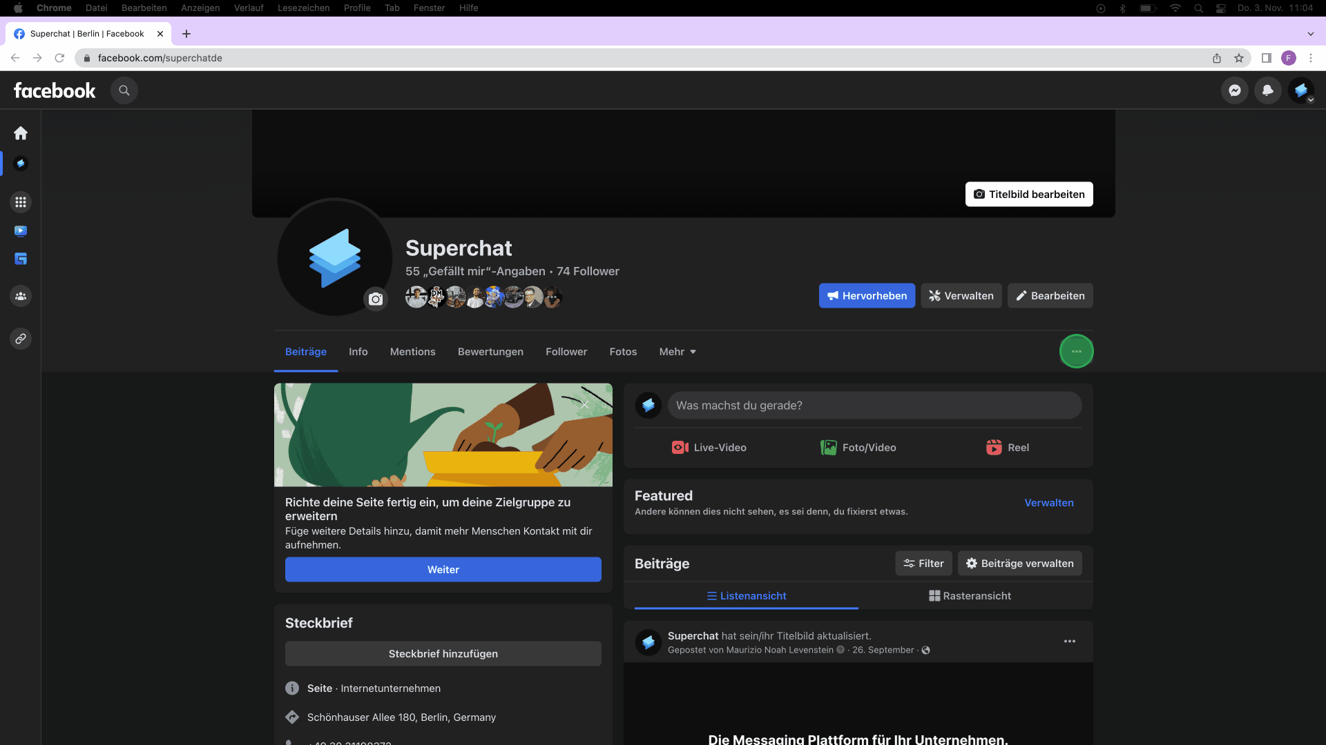 Fügen Sie zunächst Ihr Profil-, sowie das Titelbild hinzu. Nutzen Sie für das Profilbild am besten Ihr Unternehmenslogo. Das Titelbild ist größer und eignet sich daher für Fotos Ihres Firmengebäudes, den Unternehmensslogan oder für ein Teambild.