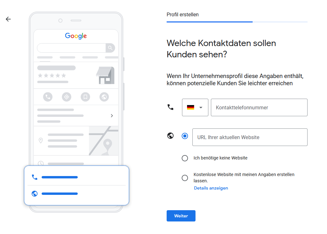 Im nächsten Schritt können Sie nun Kontaktdaten wie Ihre Telefonnummer und Ihre Website eintragen. Wenn Sie keine Website haben, können Sie einfach „Ich benötige keine Website“ anklicken oder die Möglichkeit einer kostenlosen Google-Website nutzen. Mit diesem Service von Google können Sie auch ohne eigene Homepage einen professionellen Eindruck bei Ihren Interessenten hinterlassen.