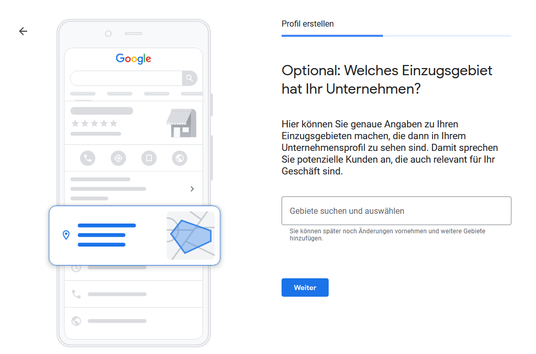Bei einem lokalen Geschäft oder Restaurant sollten Sie als nächstes das Einzugsgebiet Ihrer Kunden eintragen. Das geht übrigens auch sehr detailliert: So können Sie beispielsweise nicht nur „Berlin“, sondern ganz konkret auch den Stadtteil, also zum Beispiel „Berlin-Kreuzberg“ auswählen. Seien Sie hier besonders sorgfältig, dann werden Sie von Interessenten besser in der lokalen Suche gefunden.
