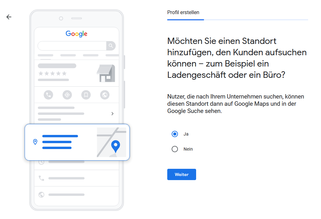 Im nächsten Schritt müssen Sie sich entscheiden, ob Sie Ihren Standort veröffentlichen möchten. Das ergibt natürlich Sinn, wenn Sie ein Ladenlokal haben, in dem Sie auch Kunden bedienen. Haben Sie allerdings ein reines Online-Business und pflegen in Ihren Büroräumlichkeiten keinen Publikumsverkehr, klicken Sie hier „Nein“ an.