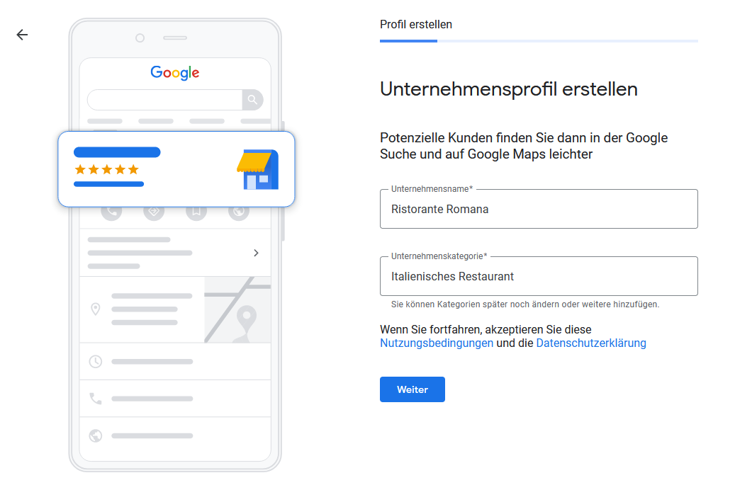 Anschließend werden Sie aufgefordert, Ihren Unternehmensnamen einzutragen. Achten Sie dabei auf eine korrekte Schreibweise. Im besten Fall verwenden Sie immer den exakt gleichen Firmennamen. Denn: Google honoriert Konsistenz mit einem höheren Ranking! Zusätzlich werden Sie nach einer Kategorie gefragt. Verwenden Sie hier die Kategorie, die Ihr Unternehmen so exakt wie möglich beschreibt. Wenn Sie also ein italienisches Restaurant führen, sollten Sie nicht nur „Restaurant“ auswählen, sondern explizit „italienisches Restaurant“.