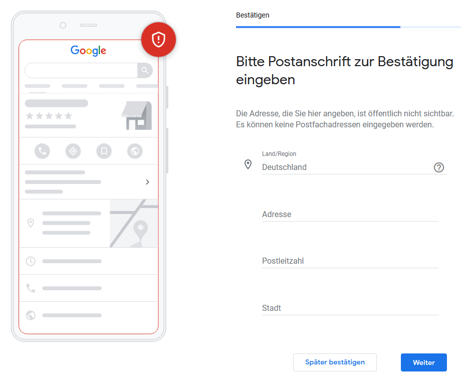 Denn anschließend müssen Sie Ihr Google Profil verifizieren lassen. Für die meisten Gründer wird es hier nur eine mögliche Bestätigungsmethode geben: den Versand einer Postkarte. Auf dieser finden Sie einen Code, mit dem Sie Ihr Google My Business Konto offiziell bestätigen können.