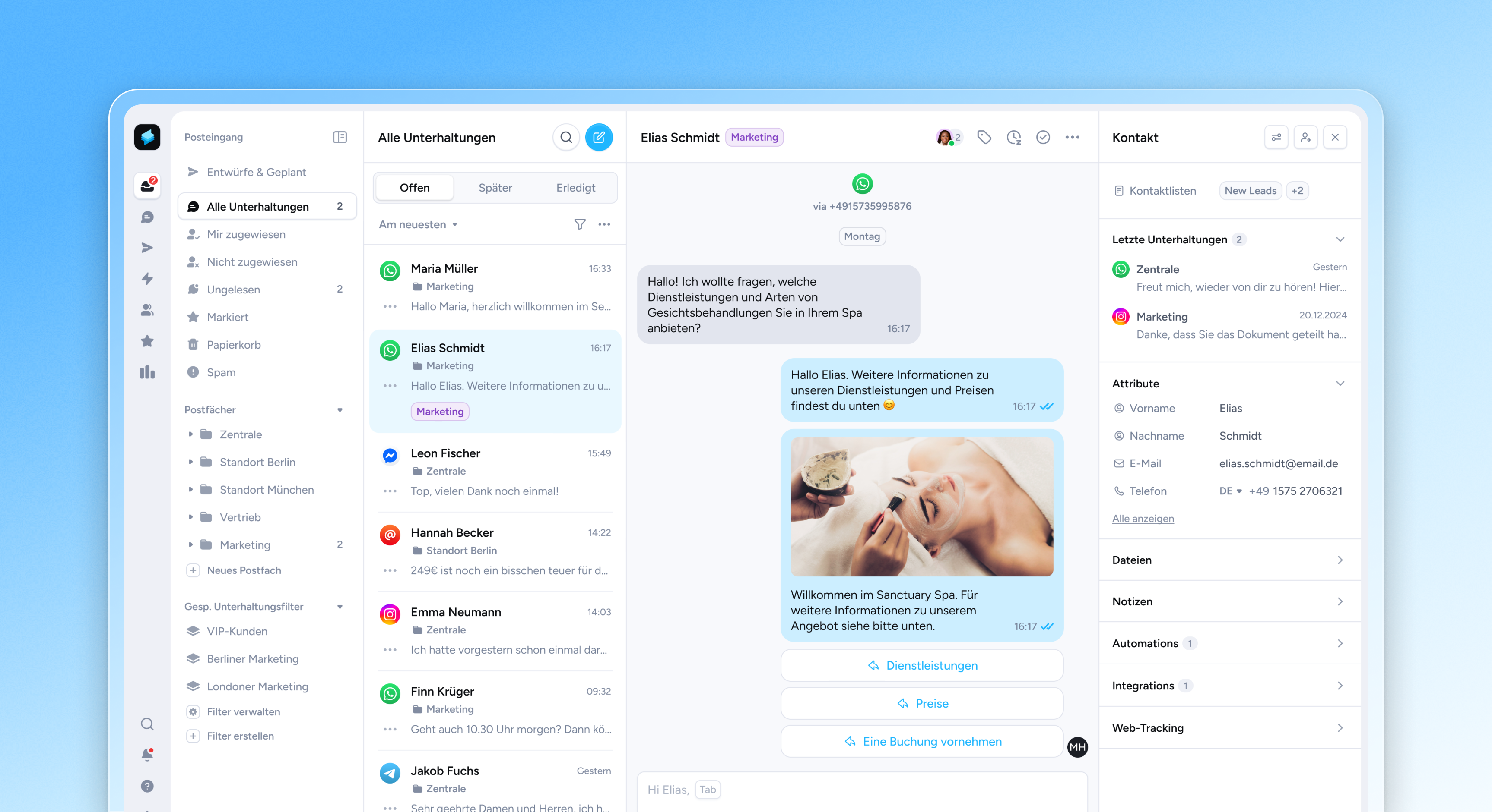 2. Zentralisieren Sie die Kommunikation: Die meisten Micro-Influencer bevorzugen Instagram Direct Messages oder WhatsApp für die Kommunikation. Tools wie Superchat bündeln alle Nachrichten aus Instagram und WhatsApp in einem zentralen Postfach.