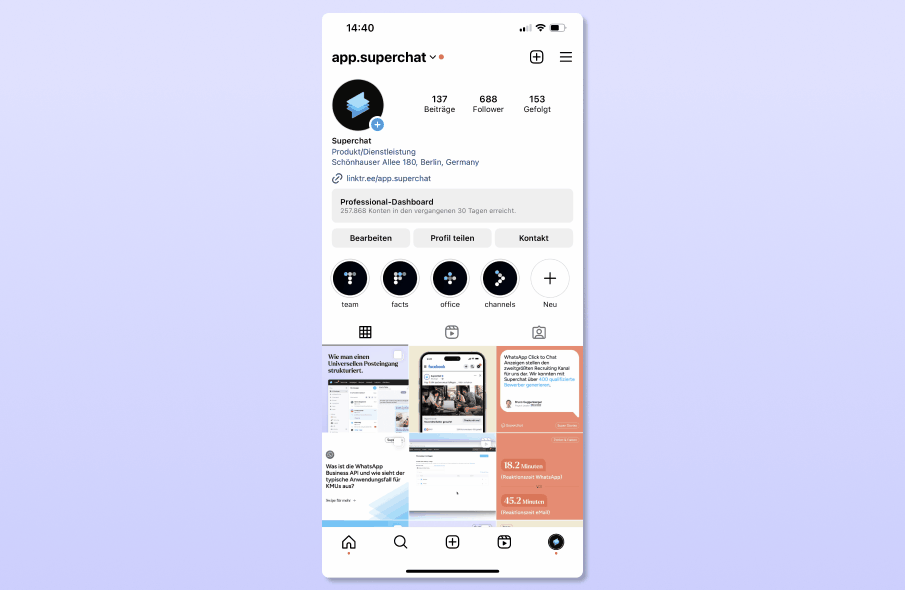 Wenn Sie Ihr Instagram in die Superchat Messaging Plattform integrieren möchten, empfehlen wir Ihnen, vorab Ihren Instagram Account mit Ihrer Facebook Unternehmensseite zu verbinden!