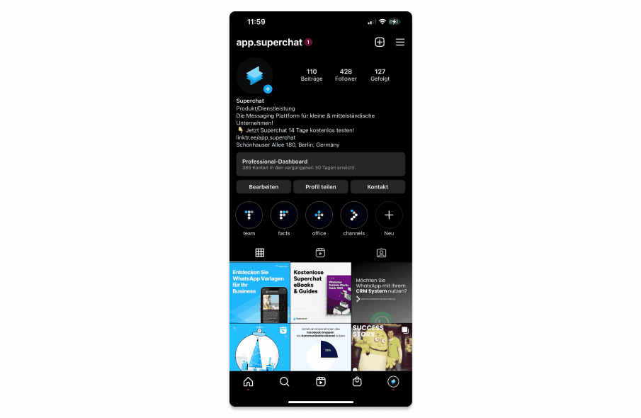 Idealerweise bieten Sie Ihren Kunden über Instagram auch eine direkte Kontaktmöglichkeit. Neben einer Direct Message können Sie beispielsweise auch den WhatsApp Business Account mit dem Instagram-Konto verknüpfen.