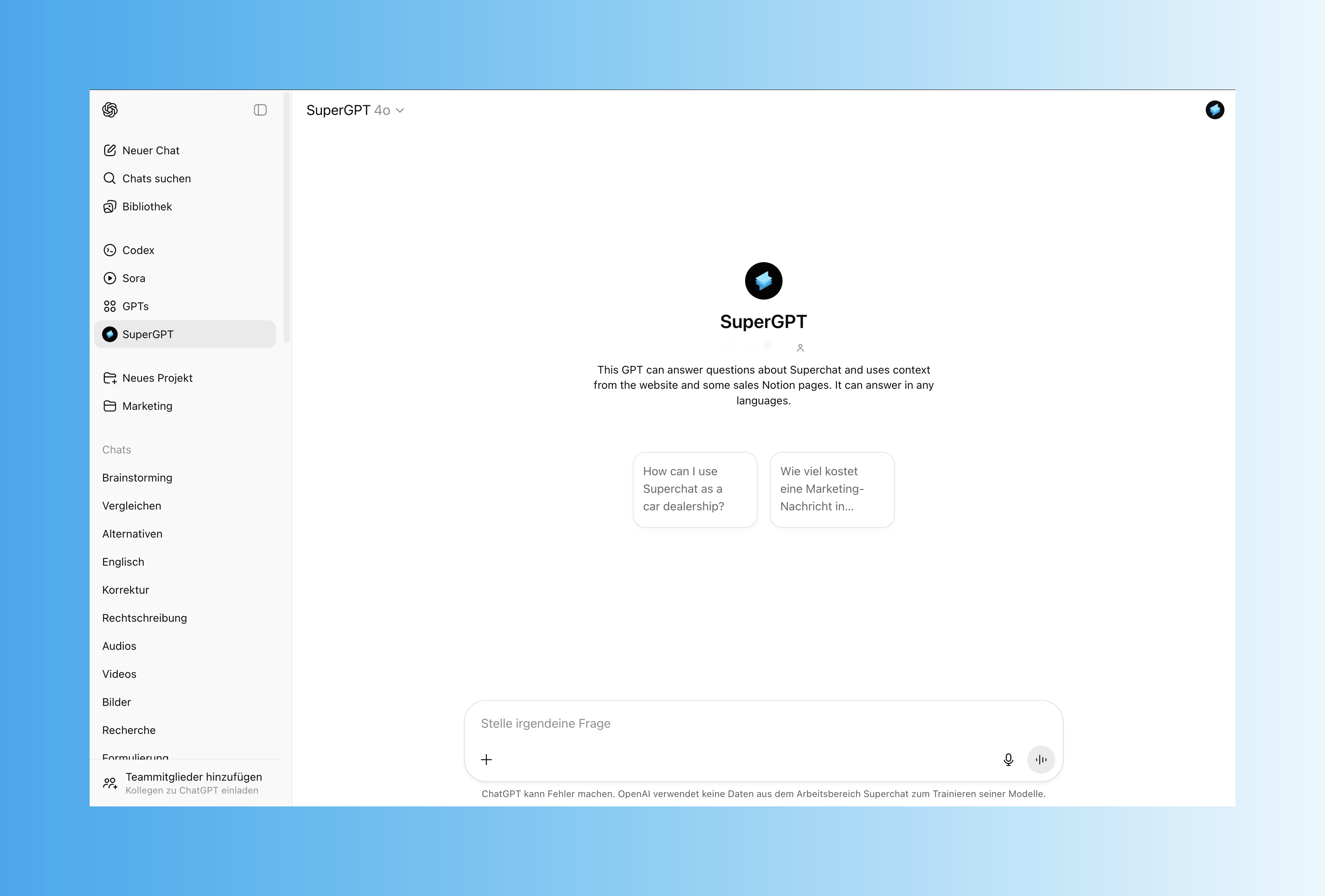Der kreative Allrounder unter den KI-Tools: generiert hochwertige Inhalte, beantwortet Supportanfragen und lässt sich per Custom GPTs individualisieren. Ideal für Content-Marketing und interaktive Kundenerlebnisse. Der KI-Chatbot von Superchat basiert auf ChatGPT (GPT-4.1).