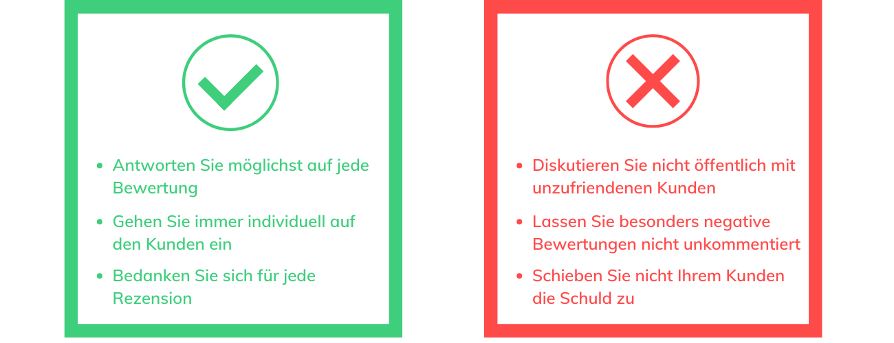 Wie schon erwähnt, sollten Sie auf jede Bewertung antworten – jedoch im besten Falle, ohne immer wieder die gleichen Formulierungen zu gebrauchen. Denn das ist weder für Ihre Interessenten noch für den Algorithmus der Suchmaschine – und damit für Ihr Ranking auf Google – von Vorteil. Hier ein paar grundsätzliche Faustregeln für Ihr Bewertungsmanagement im Überblick: