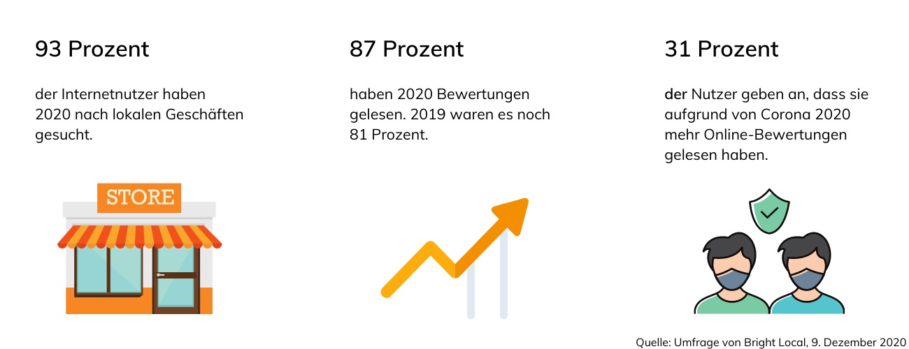 Umfragen zeigen, dass knapp 90 Prozent der Internetnutzer Bewertungen lesen. Beispielsweise, wenn sie sich ein Produkt kaufen oder eine Dienstleistung erstmalig in Anspruch nehmen möchten. Damit können Rezensionen – also authentische Erfahrungen echter Nutzer – eine große Entscheidungshilfe sein. Da so viele potenzielle Neukunden Bewertungen lesen, sollten Sie auf Ihre Rezensionen antworten. Denn Interessenten lesen nicht nur die Erfahrungen anderer Kunden, sondern achten auch darauf, wie Sie auf die Rezensionen reagieren.