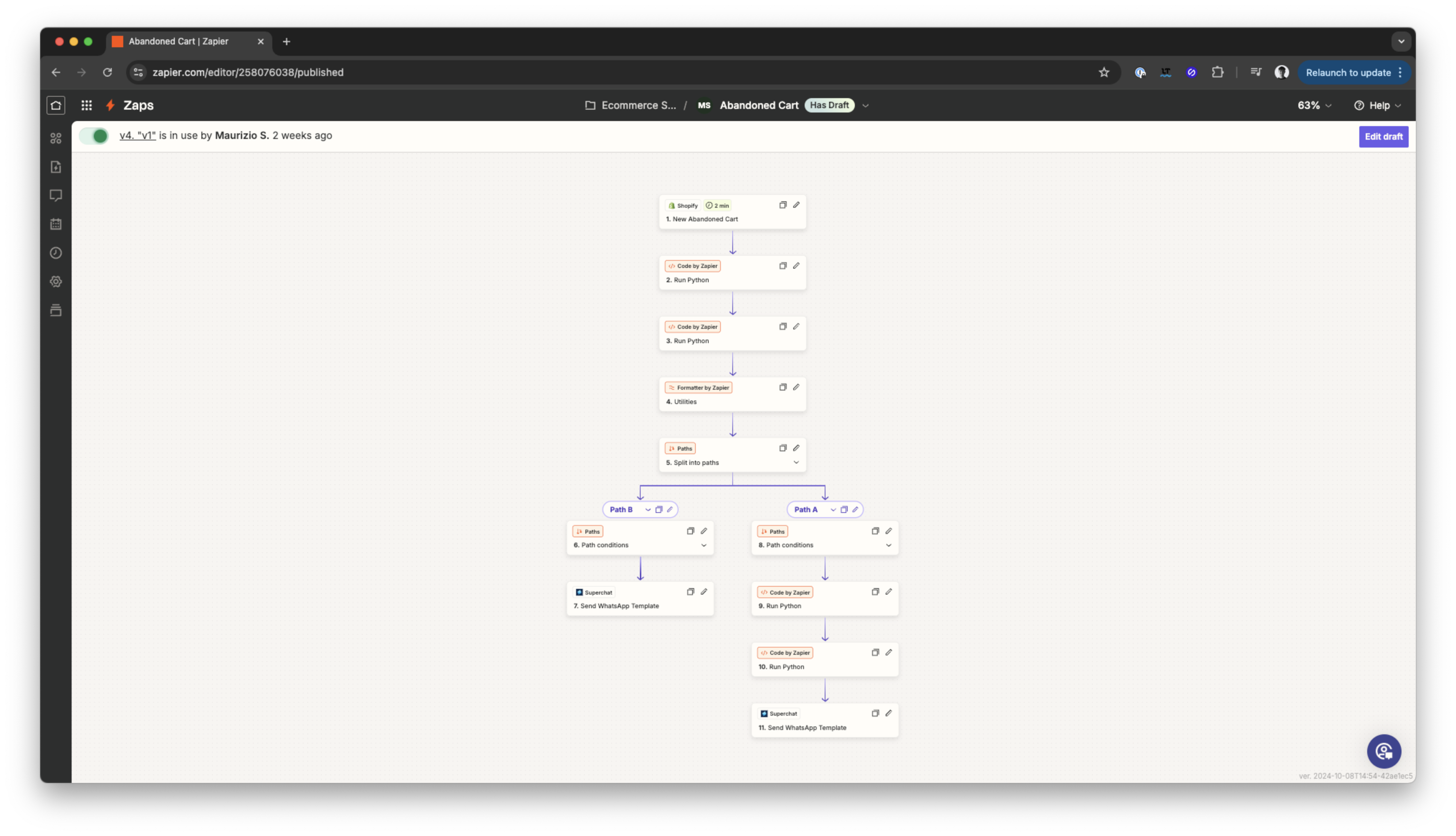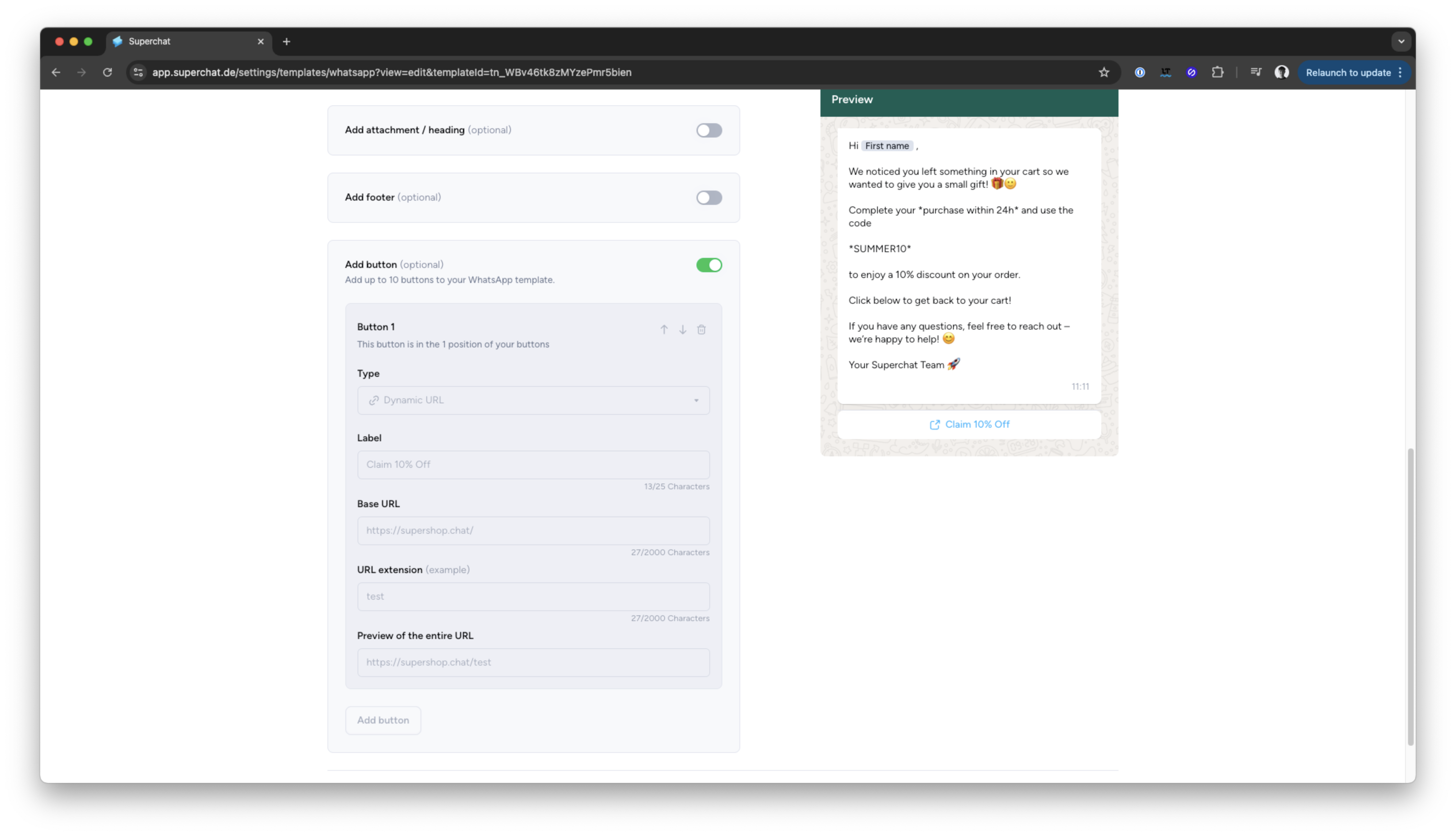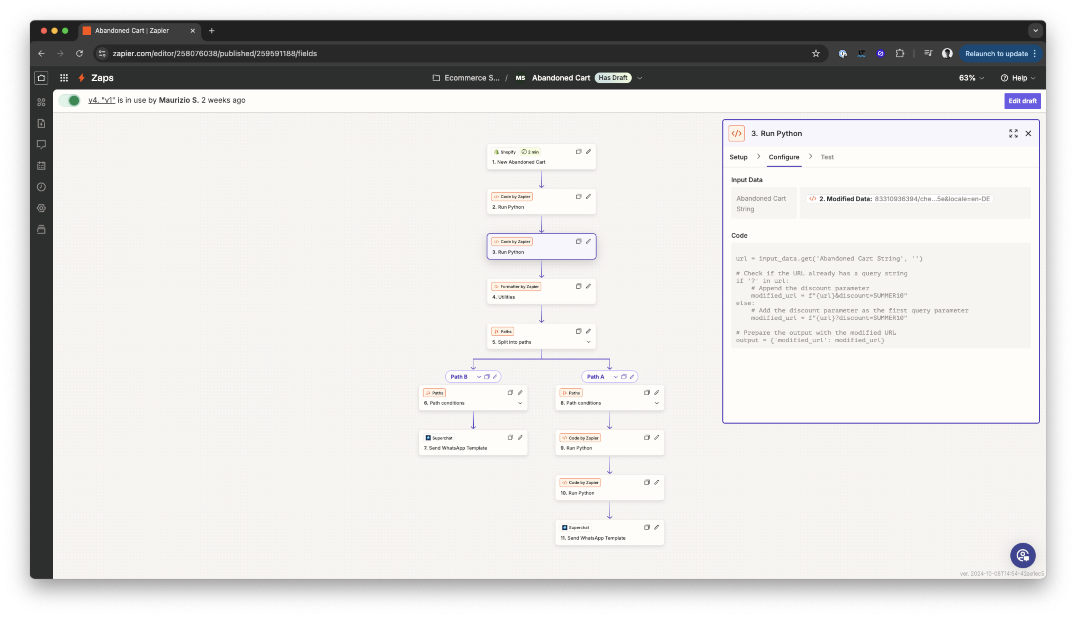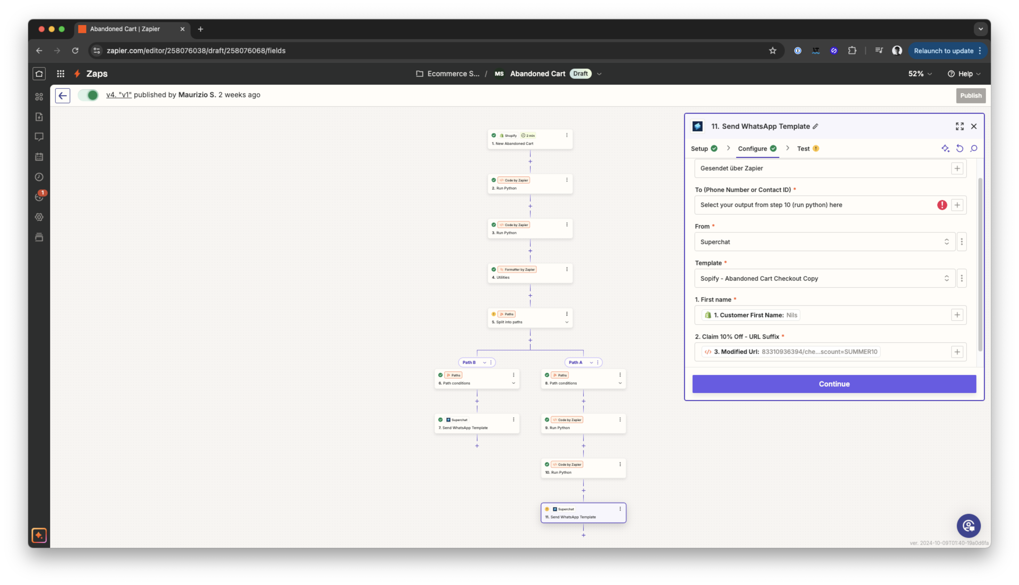 Diese Automation wird ausgelöst, wenn ein neuer abgebrochener Warenkorb-Checkout erkannt wird. Sie extrahiert die URL des verlassenen Warenkorbs des Kunden, fügt den Rabattcode hinzu und stellt sicher, dass die Telefonnummer korrekt formatiert ist, bevor eine WhatsApp-Vorlage über Superchat gesendet wird.