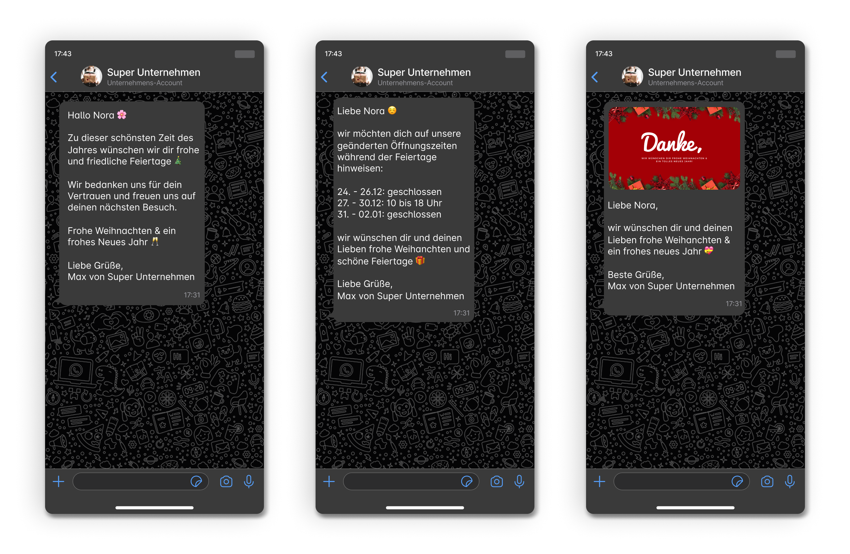Weihnachten ist ein guter Zeitpunkt, um sich bei treuen Kunden zu bedanken und einen einfachen Weihnachtsgruß zu versenden. Während das E-Mail-Postfach meist überläuft während den Feiertagen, kommen Ihre Weihnachtsgrüße per WhatsApp garantiert bei Ihrer Zielgruppe an. Textbausteine sorgen für eine persönliche Note und Emojis und Bilder lassen Ihren Weihnachtsgruß noch authentischer wirken.
