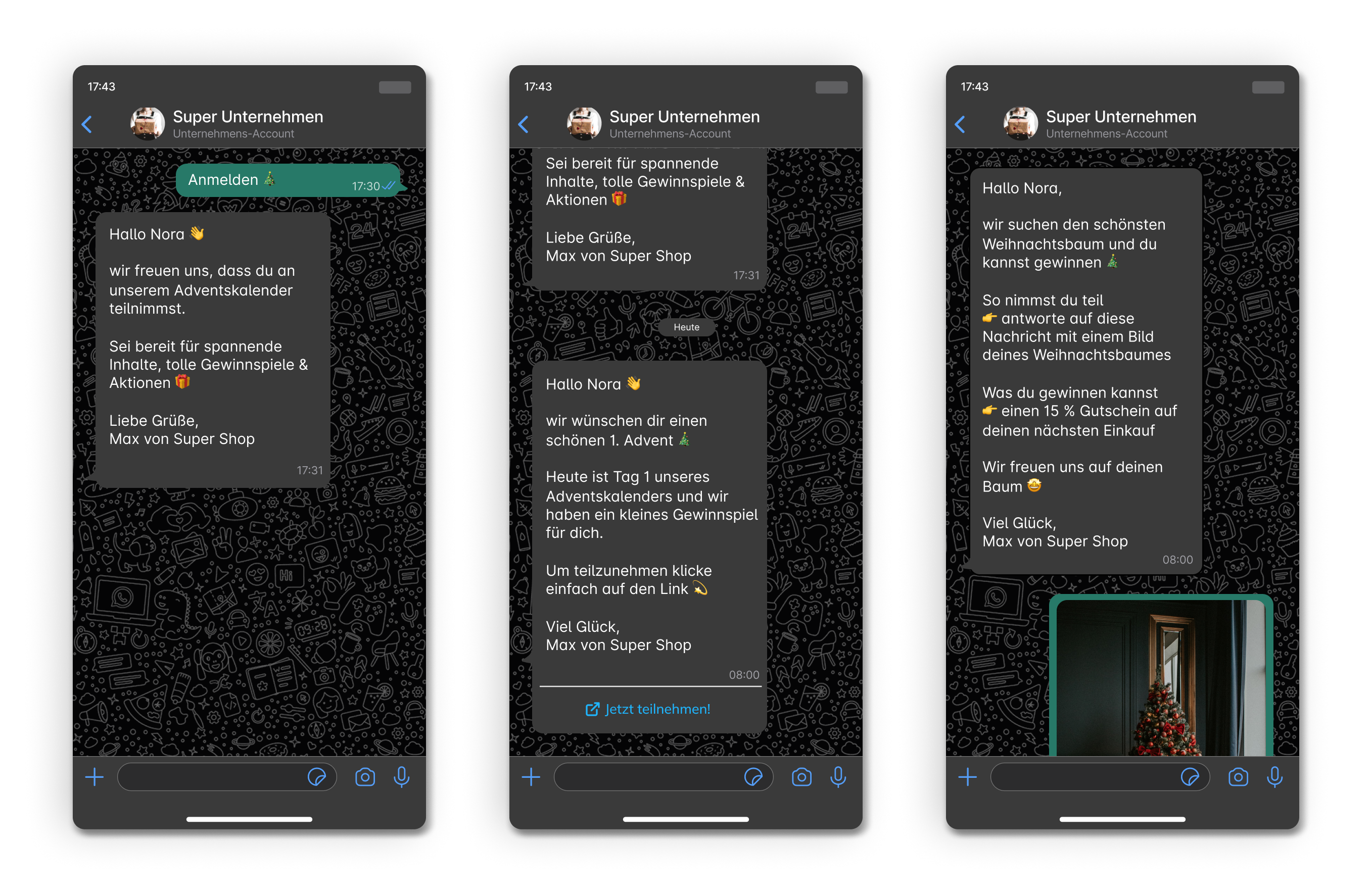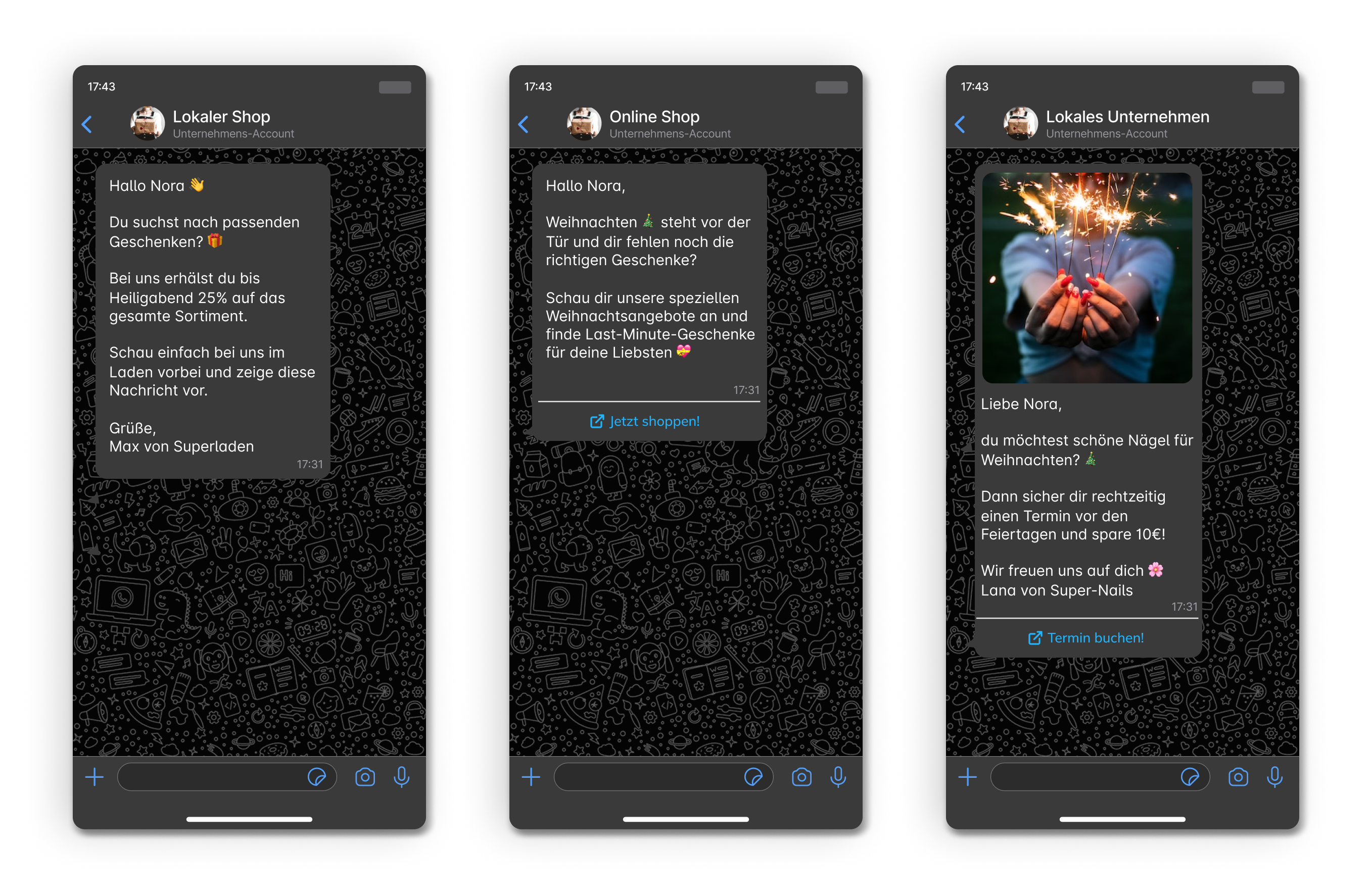 Ihrer Kreativität sind keine Grenzen gesetzt. Über WhatsApp versenden Sie Weihnachtsgrüße, personalisierte Angebote oder digitale Adventskalender.