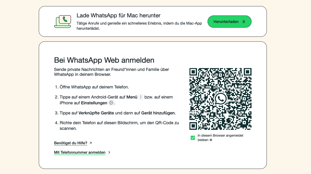 - QR-Code Setup: Anmeldung über Smartphone-Scan in "Verknüpfte Geräte"
