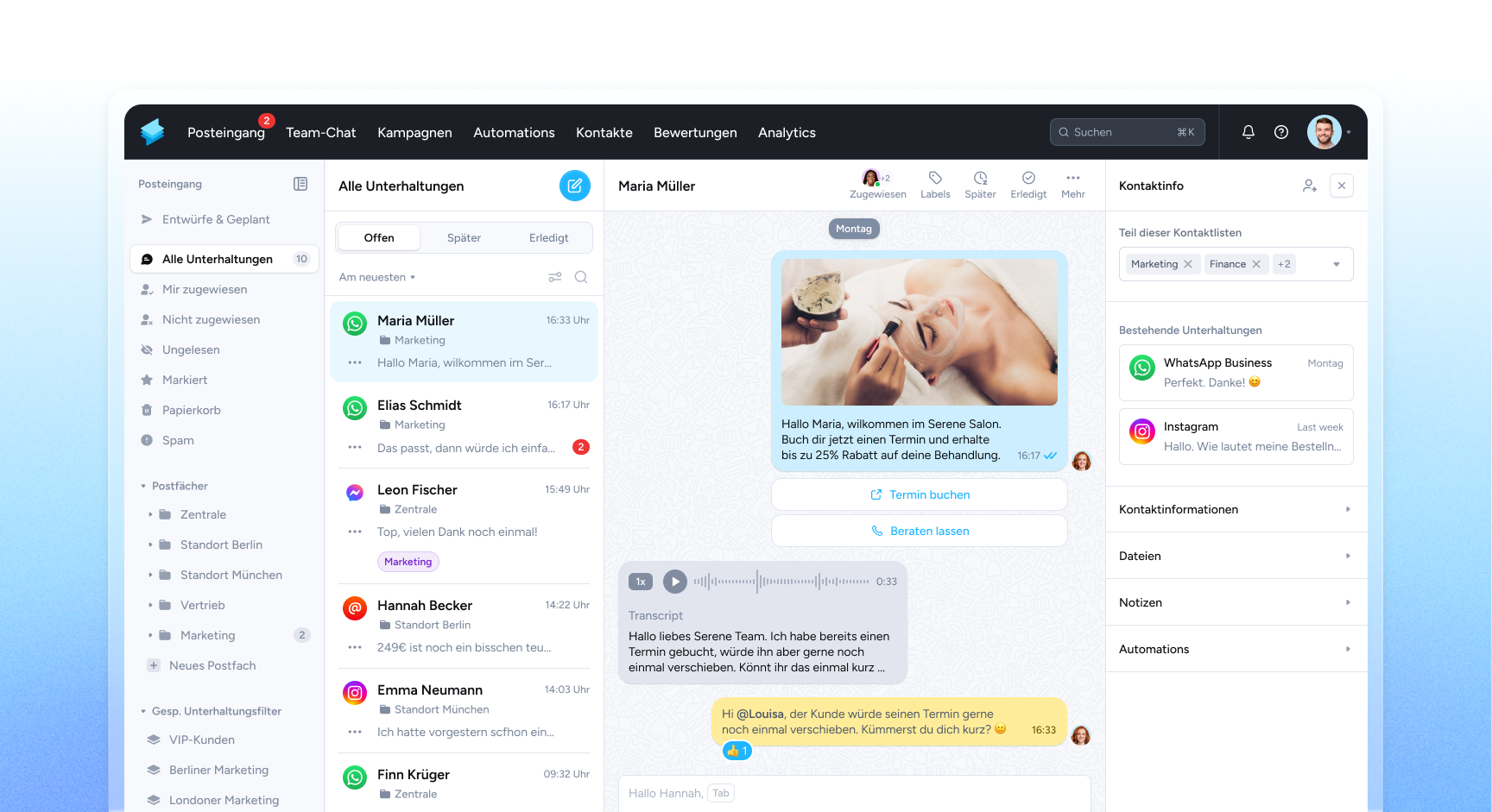 Für die effektive Nutzung mit mehreren Nutzern, Geräten, Standorten und Postfächern ist die WhatsApp Business App nicht geeignet. Abgesehen davon ist die WhatsApp Business App nicht DSGVO-konform und somit nicht für die Kommunikation mit Kunden geeignet.