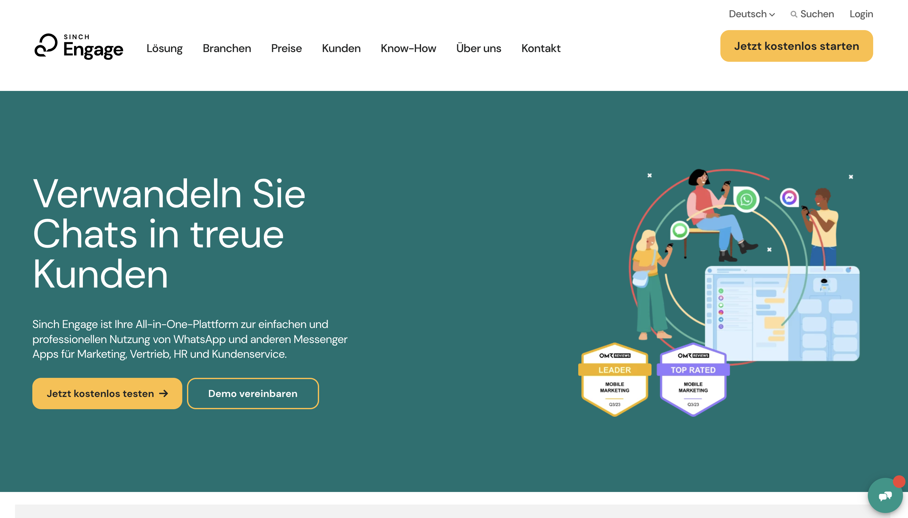 Das Münchner Unternehmen MessengerPeople wurde 2021 von dem schwedischen Konzern Sinch AB aufgekauft und zu Sinch Engage umbenannt. Die Software hat eine OMR Bewertung von 4,4 Sterne (71 Bewertungen). Sinch Engage bietet solide Messenger Software mit vielen Kanälen, aber es handelt sich um einen der hochpreisigen Anbieter in diesem Vergleich. Der günstigste Starter Plan beginnt bei 199 Euro und enthält nur einen Mitarbeiterzugang. Im Vergleich dazu enthält der günstigere Basic Plan von Superchat bereits drei Mitarbeiterzugänge.