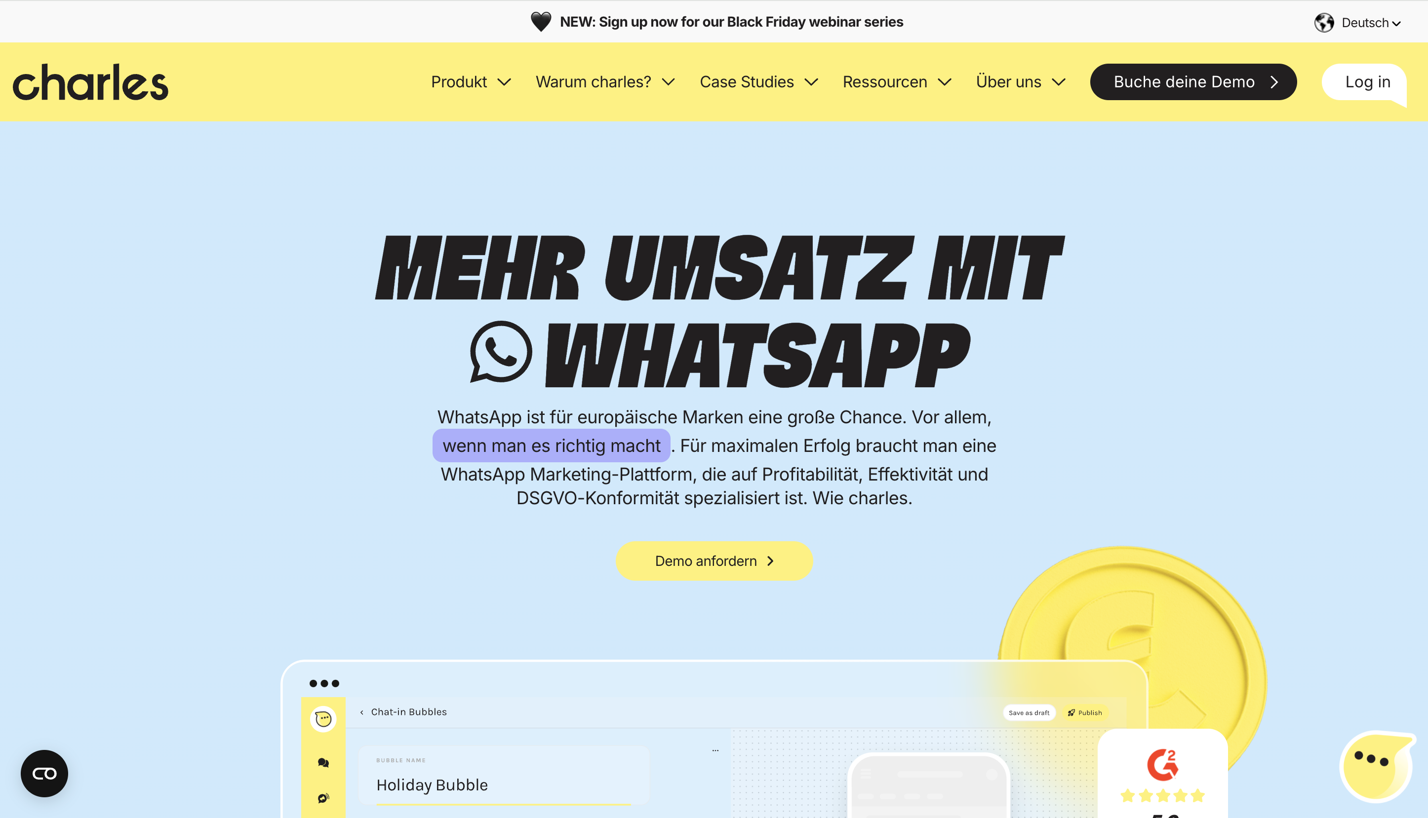 Charles wurde 2019 ursprünglich als Berliner Modemarke gegründet und hat sich seitdem zu einem spezialisierten Tool für E-Commerce Unternehmen weiterentwickelt. Die Software bietet ausschließlich WhatsApp als Kommunikationskanal an und somit handelt es sich um keine Omnichannel-Lösung. Das heißt, Sie haben keinen universellen Posteingang, der auch Social Media Nachrichten (Instagram, Facebook etc.) empfangen kann. Die Stärke von Charles ist die Integration mit dem SMS- und E-Mail-Marketing-Tool Klaviyo, wobei dies auch mit Superchat und Zapier möglich ist.