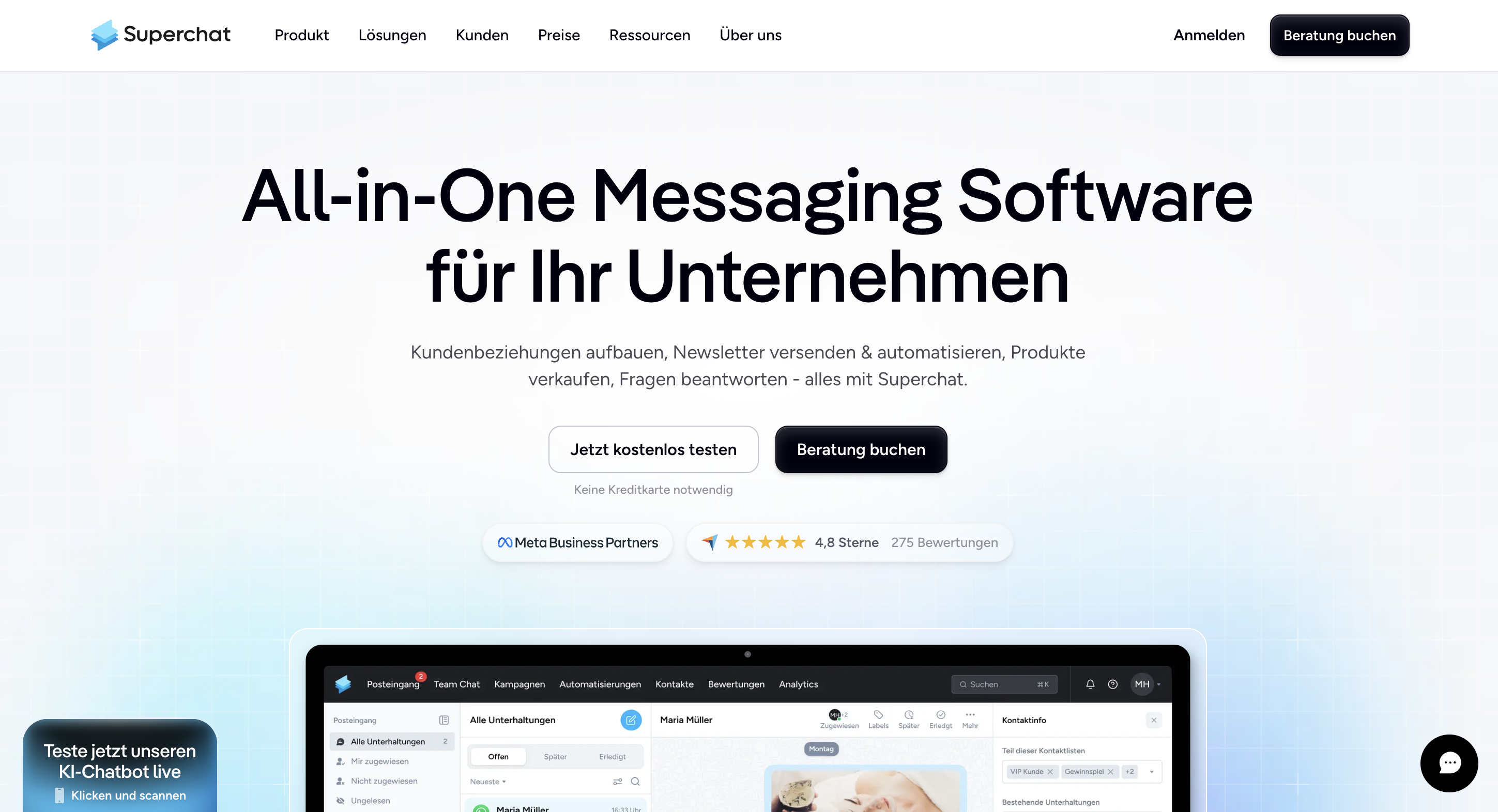 Superchat hebt sich durch seinen ganzheitlichen Ansatz von der Konkurrenz ab: Neben klassischen Kommunikationsfunktionen bietet das Tool auch eine starke Integrationsfähigkeit und einen engagierten Kundensupport, der Sie bei der Einrichtung und bei technischen Fragen unterstützt. Alles in allem setzt Superchat so den Maßstab im Bereich des WhatsApp-Marketings und hat sich als klare Nummer 1 etabliert.