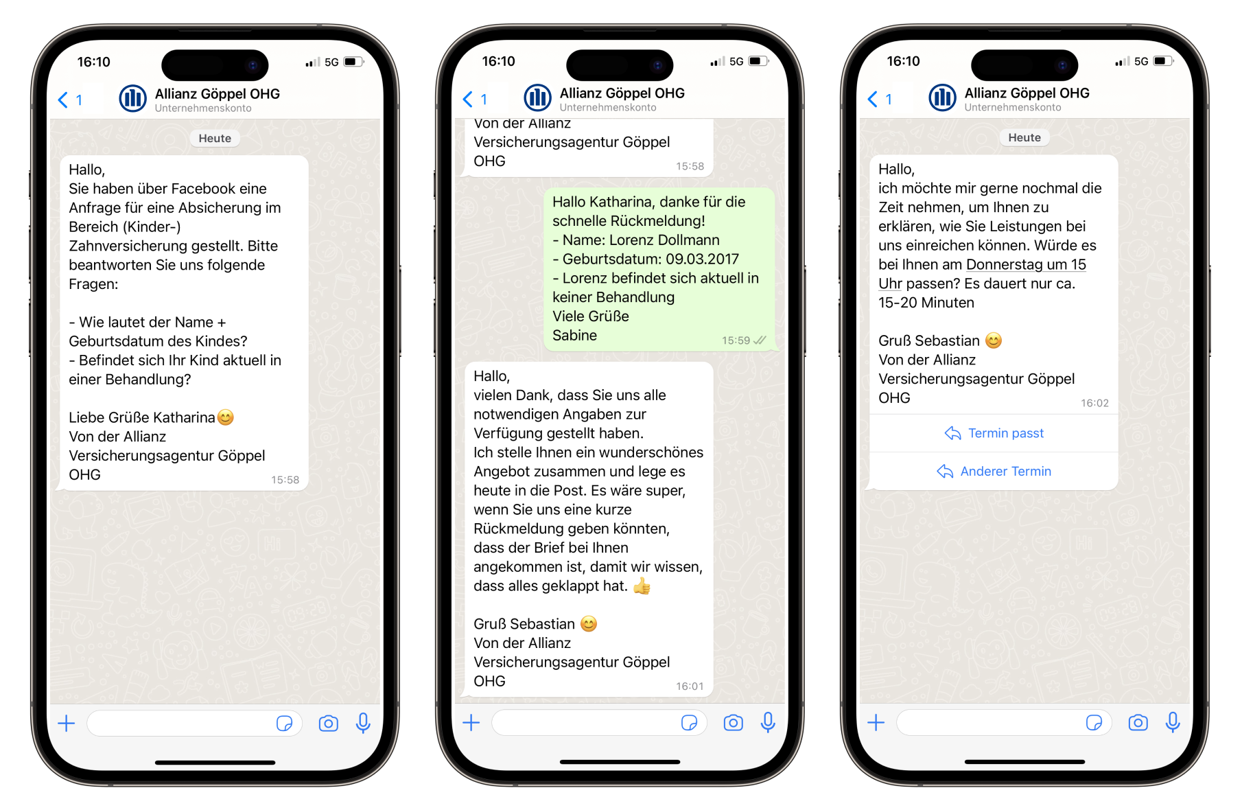 Über die Verbindung mit Zapier können automatische Nachrichten auf Basis von Kundendaten verschickt werden. Dies ermöglichte es Allianz Göppel, die Response-Rate für benötigte Daten um 50% zu steigern. Nach einer ersten Begrüßungsnachricht werden mithilfe von WhatsApp Vorlagen Kundendaten via Chat eingeholt.