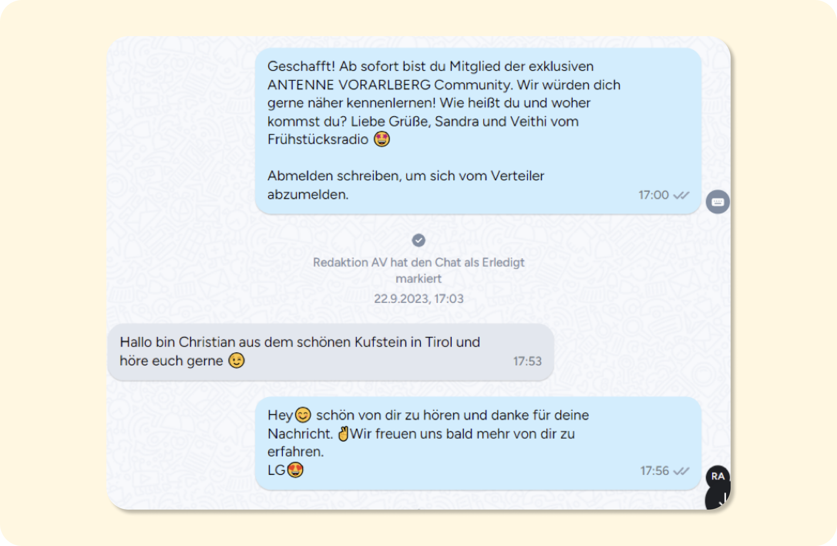 Der Austausch via Chat sorgt für eine engere Bindung zwischen Moderatoren und Zuhörern, insbesondere wenn Nachrichten im Namen beliebter Moderatoren versendet werden. Das stärkt das Zugehörigkeitsgefühl und personalisiert die Unterhaltung via WhatsApp. Man chattet schließlich nicht einfach mit einem Chatbot, sondern mit Radiostars wie Isabella Canval, Sarah Moik und Veithi.