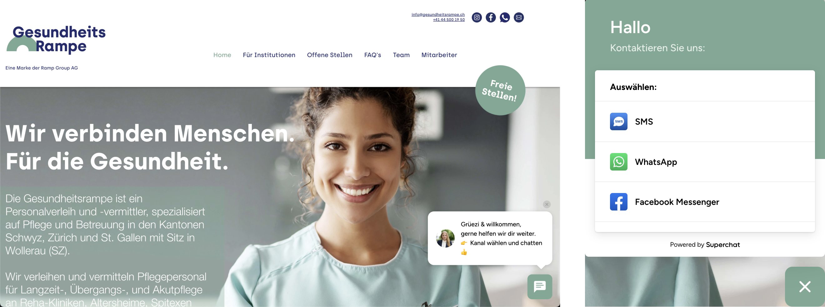 Über den Webchat können Websitebesucher mit zwei Klicks direkt eine Nachricht über SMS, WhatsApp oder den Facebook Messenger an Gesundheitsrampe schreiben. Damit macht es Gesundheitsrampe leichter Kontakt aufzunehmen und konnte so schon neue MitarbeiterInnen für sich gewinnen.