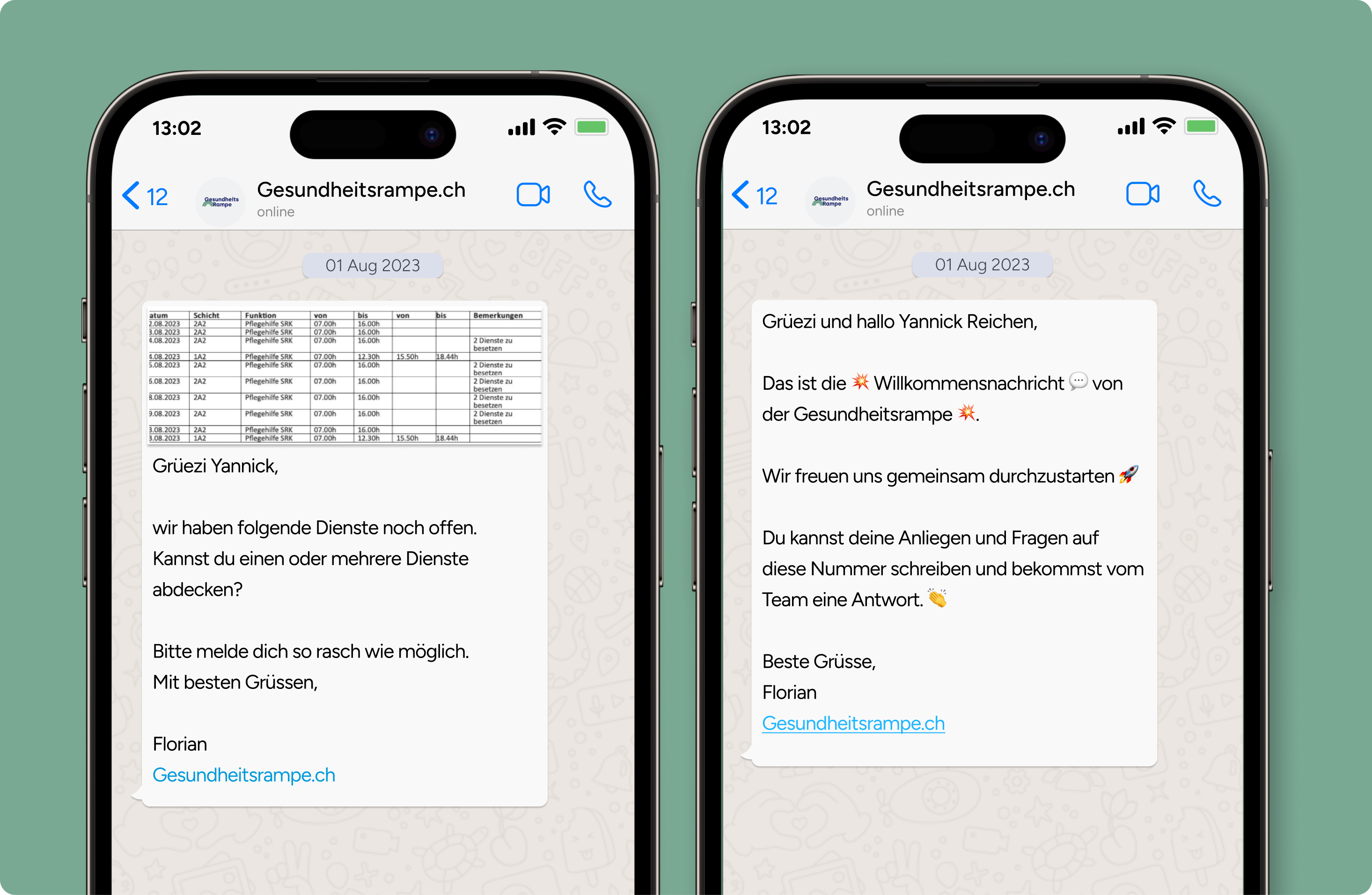 Mit Superchat hat er eine Möglichkeit gefunden, wie Gesundheitsrampe das erreichen kann. Dank der Nutzung von WhatsApp kann eine direkte und persönliche Kommunikation mit externen Mitarbeitern sichergestellt werden, die dank der eingesetzten Tools ebenso zeitsparend ist.