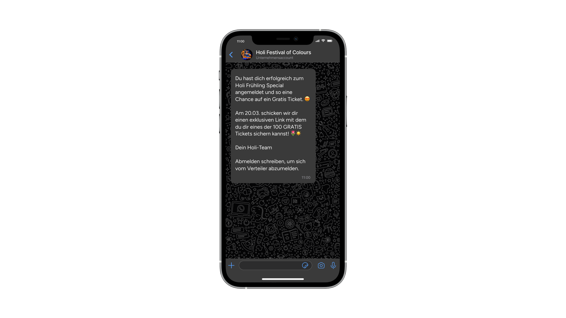 Nach dem gelungenen Einsatz von SMS als Marketing-Kanal lag die Implementierung von WhatsApp Business mithilfe von Superchat nahe. Seit Ende 2023 erfreuen sich tausende Interessenten des Holi Festivals an einem WhatsApp Newsletter mit monatlichen Verlosungen und Gewinnspielen.