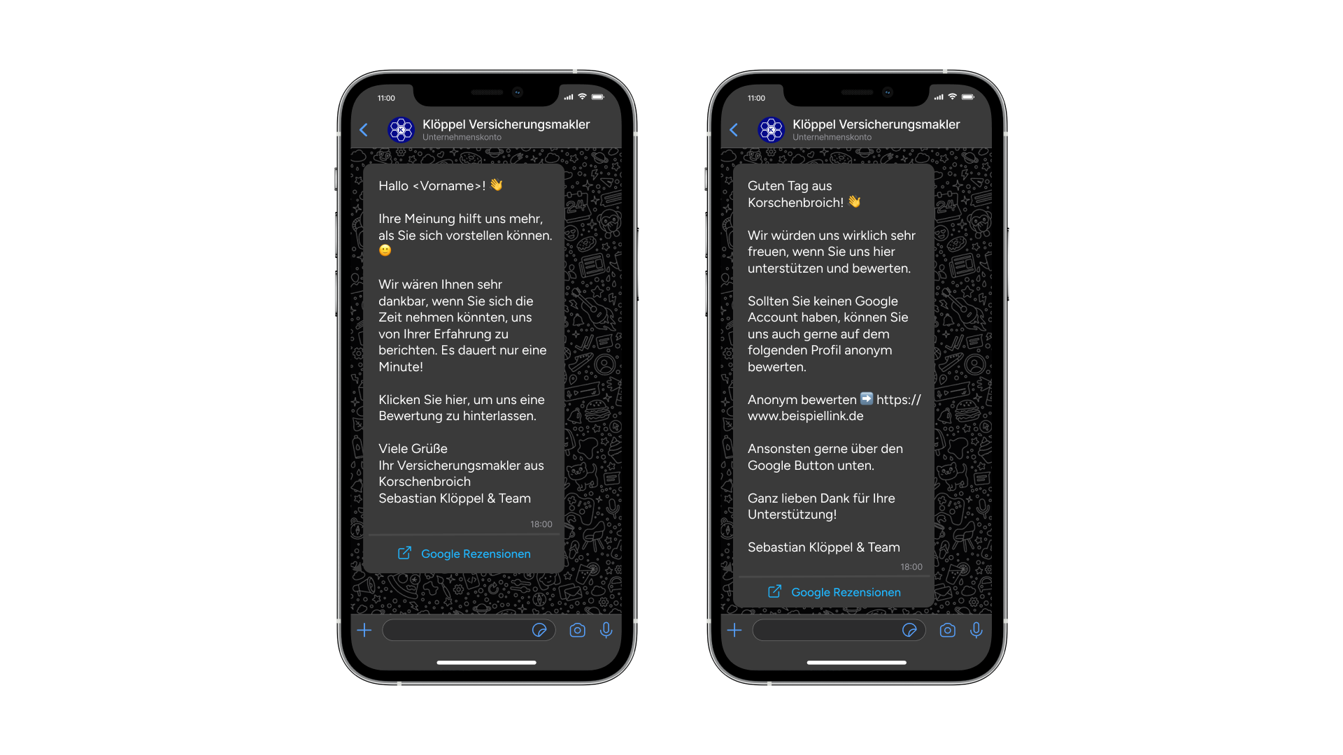 Mit den WhatsApp-Vorlagen kann das Team von Sebastian Klöppel einen Entwurf für die Bewertungseinladungen speichern und immer wieder verwenden. Ein Klick genügt, um die Vorlage auszuwählen und zu versenden.