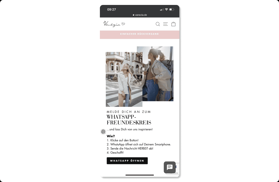Darum finden wir den Newsletter super: Besonders gut gefällt uns hier, dass Vanezia nicht einfach einen Newsletter versendet, sondern eine Community bildet. Das Unternehmen lädt Kunden mit der Anmeldung in den "WhatsApp-Freundeskreis" ein und schafft so ein gewisses Gemeinschaftsgefühl.